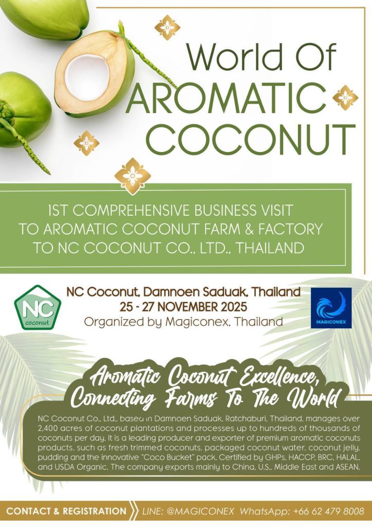 Gain first-hand insights into Thailand’s aromatic coconut industry—covering farm management, production processes, product innovation, and market opportunities—and explore business collaborations with NC Coconut.